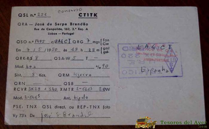 ANTIGUA TARJETA QSL . CT1TK - LISBOA (PORTUGAL) - AÑOS 50