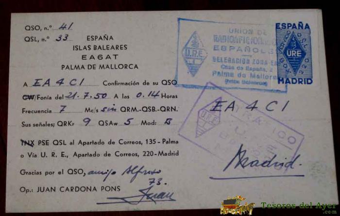 ANTIGUA TARJETA QSL . EA6AT - PALMA DE MALLORCA - AÑOS 50