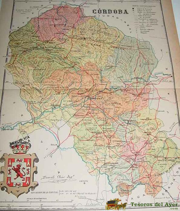 ANTIGUO MAPA DE CORDOBA - EPOCA DE LA REPUBLICA ESPAÑOLA - SE APRECIA EN EL ESCUDO COMO EN LA IMPRENTA TACHARON LA CORONA CON SELLO DE LA REPUBLICA ESPAÑOLA - ED. A. MARTIN - MIDE 36 X 27 CMS.