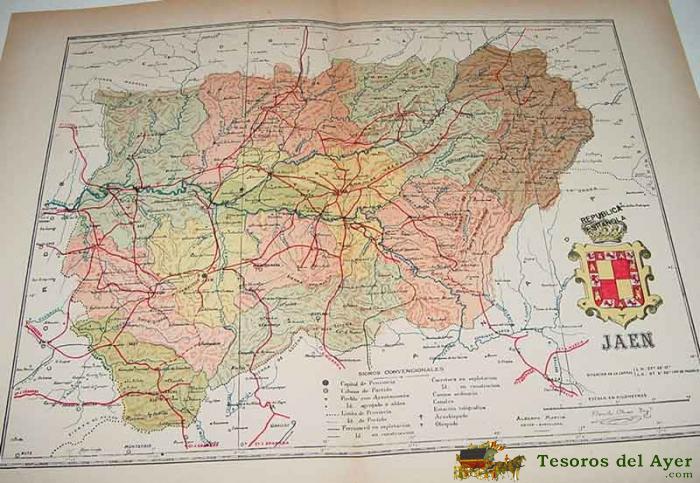 ANTIGUO MAPA DE JAEN - EPOCA DE LA REPUBLICA ESPAÑOLA - SE APRECIA EN EL ESCUDO COMO EN LA IMPRENTA TACHARON LA CORONA CON SELLO DE LA REPUBLICA ESPAÑOLA - ED. A. MARTIN - MIDE 36 X 27 CMS.