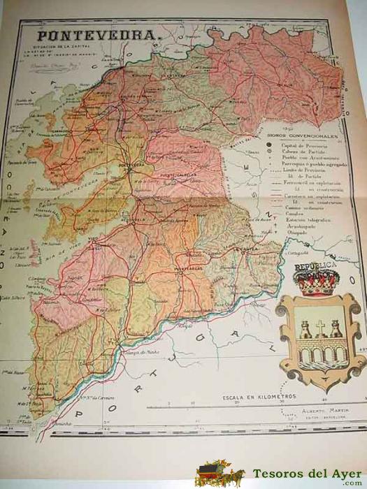 ANTIGUO MAPA DE PONTEVEDRA - EPOCA DE LA REPUBLICA ESPAÑOLA - SE APRECIA EN EL ESCUDO COMO EN LA IMPRENTA TACHARON LA CORONA CON SELLO DE LA REPUBLICA ESPAÑOLA - ED. A. MARTIN - MIDE 36 X 27 CMS.