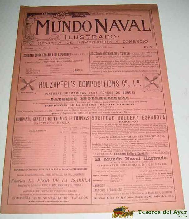 REVISTA EL MUNDO NAVAL ILUSTRADO (MADRID, 10 DE ABRIL DE 1900) - EJEMPLAR NúMERO 9 SEGUNDA EPOCA, DE LA IMPORTANTE REVISTA QUINCENAL "EL MUNDO NAVAL ILUSTRADO", DIRIGIDO POR DON PEDRO NOVO Y COLSON. MUCHISIMAS FOTOGRAFIAS E ILUSTRACIONES DE D. EDUARDO AZNAR Y DE LA SOTA, RAMON DE LA SOTA Y AZNAR, EDUARDO DE AZNAR Y TUTOR, EL VAPOR LEKEITIO DE LA CASA SOTA Y AZNAR, EL VAPOR MAYO DE AZNAR Y COMPAÑIA, SISTEMA TURRET, EL VAPOR SEPTIEMBRE, EL VAPOR ALBIA, EL VAPOR SESTAO, EL VAPOR NOVIEMBRE, EL CRUCERO INGLES HIGHFYER, CAÑONERO INGLES DE RIO, LA ESCUADRA INGLESA DEL MEDITERRANEO, EL CONTENIDO DE ESTA REVISTA ES IMPRESIONANTE, TANTO EN ARTíCULOS REFERIDOS AL MUNDO NAVAL COMO A LAS REPRODUCCIONES FOTOGRáFICAS DE PERSONAJES LIGADOS A ESTA PARCELA. EL NúMERO ESTá COMPLETO Y CONSTA DE 24 PáGINAS Y FORMATO DE 26 X 37 CM.