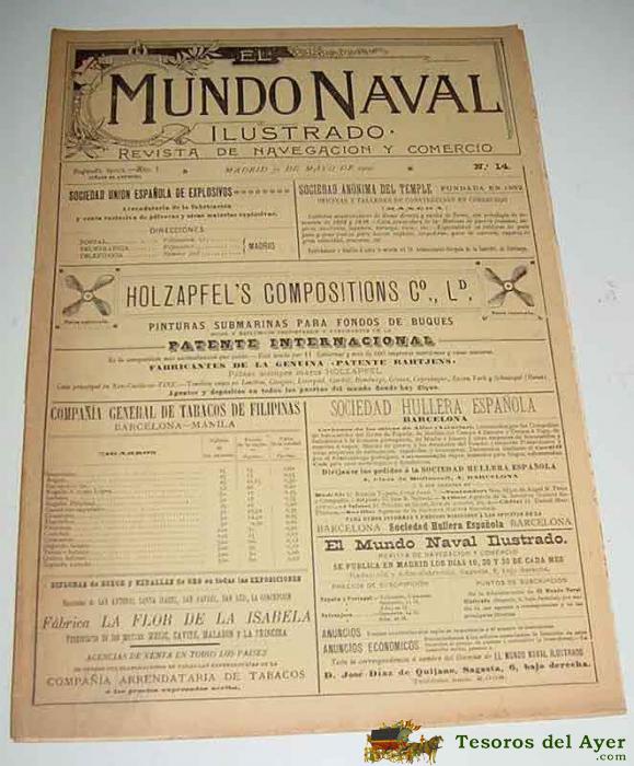 REVISTA EL MUNDO NAVAL ILUSTRADO (MADRID, 30 DE MAYO 1900) - EJEMPLAR NúMERO 14 SEGUNDA EPOCA, DE LA IMPORTANTE REVISTA QUINCENAL "EL MUNDO NAVAL ILUSTRADO", DIRIGIDO POR DON PEDRO NOVO Y COLSON. MUCHISIMAS FOTOGRAFIAS E ILUSTRACIONES DE LA ESCUADRA INGLESA DEL MEDITERRANEO, TRANSBORDADOR SPENCER MILLER, VAPOR TRASATLANTICO OCEANIC, SOCIEDAD ANONIMA DE METALURGIA Y CONSTRUCCIONES, SOCIEDAD VIZCAYA, HORNOS ALTOS, EL ACORAZADO BELE ISLEEL ARCHIDUQUE DE AUSTRIA FERNANDO CARLOS, EL CONTENIDO DE ESTA REVISTA ES IMPRESIONANTE, TANTO EN ARTíCULOS REFERIDOS AL MUNDO NAVAL COMO A LAS REPRODUCCIONES FOTOGRáFICAS DE PERSONAJES LIGADOS A ESTA PARCELA. EL NúMERO ESTá COMPLETO Y CONSTA DE 18 PáGINAS Y FORMATO DE 26 X 37 CM.