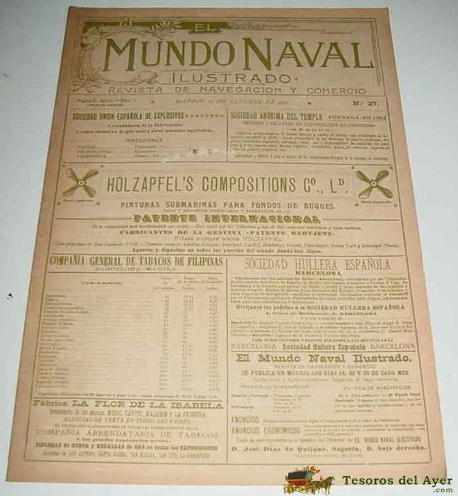 REVISTA EL MUNDO NAVAL ILUSTRADO (MADRID, 10 DE OCTUBRE 1900) - EJEMPLAR NúMERO 27 SEGUNDA EPOCA, DE LA IMPORTANTE REVISTA QUINCENAL "EL MUNDO NAVAL ILUSTRADO", DIRIGIDO POR DON PEDRO NOVO Y COLSON. MUCHISIMAS FOTOGRAFIAS E ILUSTRACIONES DE EL PUERTO DE VLADIVOSTOCK, YATE CUCA DE D. JOAQUIN BUSTAMANTE, EL YATE CARITA DEL SR. MARTINEZ RIVAS, YATE MARIS STELLA DE LOS HEMANOS SRES. BUSTAMANTE DE SANTANDER, YATE CHOUCHA DE LOS SRES. ARANA Y CAREAGA, EL SPORTING CLUB BILBAINO, YATE LIN DEL SR. CORRAL, YOLES DE ARCACHON Y BAYONA, YATE TERESA DE D. PEDRO DE LAISECA DE BILBAO, EL BARCO MATAFUEGOS ALPHA DEL PUERTO DE LONDRES, EL TORPEDERO SUBMARINO NARVAL, BARCO DE CINCO PALOS POTOSI EL MAYOR VELERO DEL MUNDO, EL CONTENIDO DE ESTA REVISTA ES IMPRESIONANTE, TANTO EN ARTíCULOS REFERIDOS AL MUNDO NAVAL COMO A LAS REPRODUCCIONES FOTOGRáFICAS DE PERSONAJES LIGADOS A ESTA PARCELA. EL NúMERO ESTá COMPLETO Y CONSTA DE 18 PáGINAS Y FORMATO DE 26 X 37 CM.