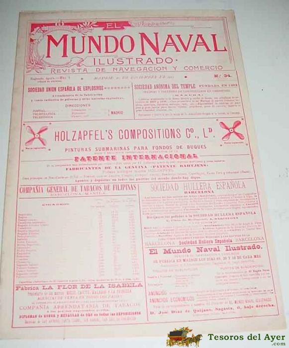SEGUNDA EPOCA, DE LA IMPORTANTE REVISTA QUINCENAL "EL MUNDO NAVAL ILUSTRADO", DIRIGIDO POR DON PEDRO NOVO Y COLSON. MUCHISIMAS FOTOGRAFIAS E ILUSTRACIONES DE CRONICA NAVAL, D. ADOLFO NAVARRETE Y DE ALCAZAR, TENIENTE DE NAVIO E INICIADOR DE LA LIGA MARITIMA ESPAÑOLA, CRUCERO ABOUKIR, PROYECTO PUENTE ORILLAS DEL BOSFORO, CONSTANTINOPLA, VAPOR MONTSERRAT COMPAÑIA TRASATLANTICA, YATE ARROW, TORPEDERO ARROW, RAFAEL MONLEON Y TORRES, EL CONTENIDO DE ESTA REVISTA ES IMPRESIONANTE, TANTO EN ARTíCULOS REFERIDOS AL MUNDO NAVAL COMO A LAS REPRODUCCIONES FOTOGRáFICAS DE PERSONAJES LIGADOS A ESTA PARCELA. EL NúMERO ESTá COMPLETO Y CONSTA DE 18 PáGINAS Y FORMATO DE 26 X 37 CM.