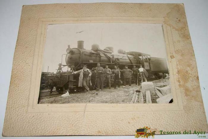 ANTIGUA FOTOGRAFIA DE UNA LOCOMOTORA ESPAÑOLA JUNTO CON EL PERSONAL DE SERVICIO FOGONERO, MAQUINISTA ETC..EN ESPAÑA AÑOS 30 - 40 - MIDE 17,5 X 13 CMS. - CON PASPARTOUT MIDE 26 X 20,5 CMS. - FUE DOBLADA TAL COMO SE PUEDE VER EN LA FOTO TOMADA, AUNQUE NO AFECTA A SU CALIDAD.