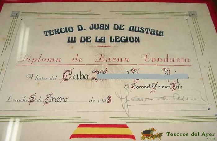 ANTIGUO DIPLOMA ENMARCADO DE BUENA CONDUCTA - DEL TERCIO D. JUAN DE AUSTRIA III DE LA LEGION - A FAVOR DE UN CABO - SE LE HA BORRADO EL NOMBRE EN LA FOTOGRAFIA, PERO NO EN EL ORIGINAL - MIDE 38 X 29,5 CMS.