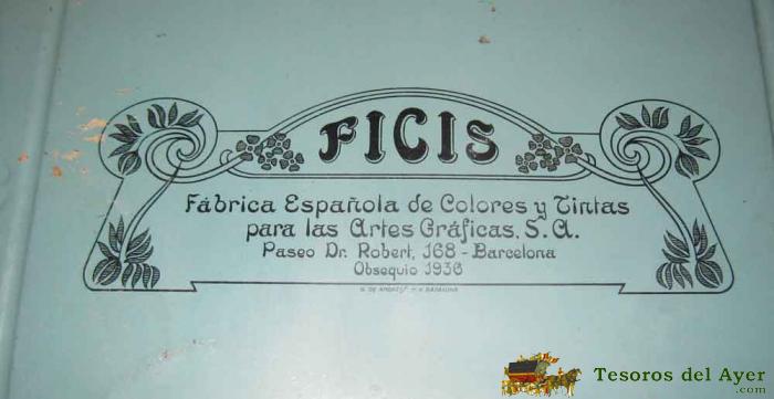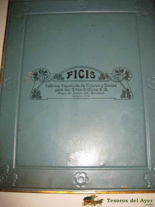 ANTIGUA CHAPA DE HOJALATA LITOGRAFIADA CON PUBLICIDAD DE FICIS, G. DE ANDREIS DE BADALONA . FABRICA ESPAÑOLA DE COLORES Y TINTAS PARA LAS ARTES GRAFICAS S.A. OBSEQUIO 1936 - MIDE 33 X 26,5 CMS. EXCELENTE ESTADO DE CONSERVACION