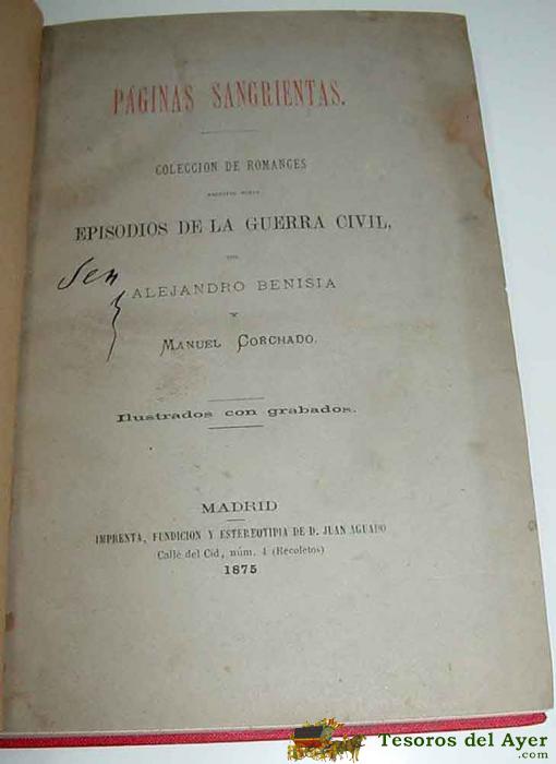 ANTIGUO LIBRO PÁGINAS SANGRIENTAS - COLECCIóN DE ROMANCES ESCRITOS SOBRE EPISODIOS DE LA GUERRA CIVIL - CARLISMO - POR BENISIA, ALEJANDRO Y CORCHADO, MANUEL - IMP. JUAN AGUADO. MADRID, 1875 - MIDE 22 CM - XI-249 PáG., - ILUSTR. CON 12 GRABADOS EN LáM., UNA PLEGADA, FUERA DEL TEXTO - RETRATOS DE CABRINETY, EL CURA DE SANTA CRUZ, EL GENERAL CASTILLO, MORIONES, EL MARQUéS DEL DUERO, PRIMO DE RIVERA, SCHMIDT (SúBDITO PRUSIANO FUSILADO POR LOS CARLISTAS) Y VARIAS LáMINAS DE ESCENAS DE GUERRA - MUY INTERESANTE.