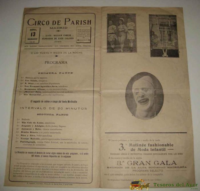 ANTIGUO CARTEL PROGRAMA LITOGRAFIADO DEL CIRCO PARISH DE MADRID, 13 DE ABRIL DE 1918 - WILIAM PARISH - LES VITALS, E. DIAZ Y SUS CABALLITOS LILIPUTIENSES, LES FERNAND, AGUSTINA, JAVA SALTADORES, HERMANOS ALBANO, MORENO BROS, THE MORANDINI, THE COLE DE LOSSE ALAMBRISTA, AUGUSTE Y ADOLPHE DOBLE JOCKEY DEPSON, ANTONETT Y BEBY, BENITO BRACCO Y SU JAURIA AMAESTRADA, RICO Y ALEX, TROUPE MELVILLE, PARISHGRAPH - DIPTICO QUE TIENE 4 PAGINAS INCLUYENDO LAS CUBIERTAS, MIDE DESPLEGADO 30,5 X 29 CMS. TAL COMO SE VE EN LAS FOTOS PUESTAS.
