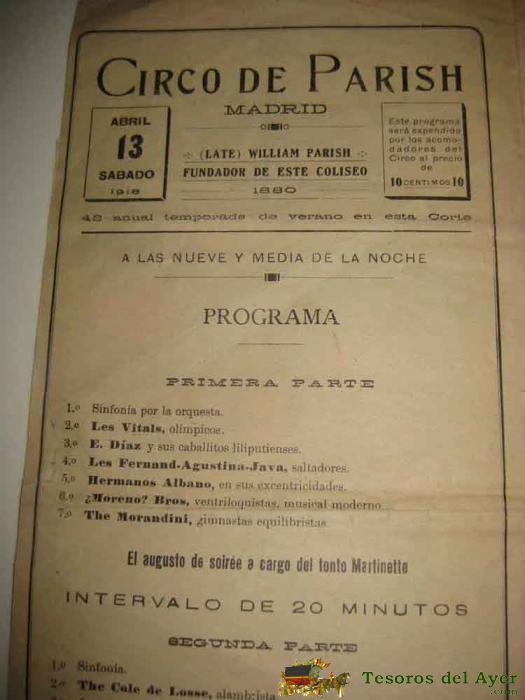 ANTIGUO CARTEL PROGRAMA LITOGRAFIADO DEL CIRCO PARISH DE MADRID, 13 DE ABRIL DE 1918 - WILIAM PARISH - LES VITALS, E. DIAZ Y SUS CABALLITOS LILIPUTIENSES, LES FERNAND, AGUSTINA, JAVA SALTADORES, HERMANOS ALBANO, MORENO BROS, THE MORANDINI, THE COLE DE LOS
