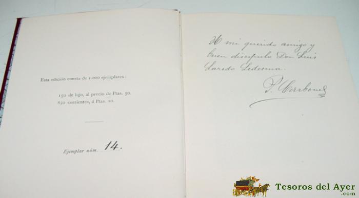 ANTIGUA LIBRO TEORíA Y PRáCTICA DE LA ESGRIMA - CON FIRMA Y DEDICATORIA AUTOGRAFA DEL AUTOR A UNO DE SUS ALUMNOS - (OBRA DECLARADA DE UTILIDAD Y DE CONSULTA POR R. O. DE 8 DE ENERO DE 1900, PREVIO INFORME DE LA JUNTA CONSULTIVA DE GUERRA, PARA LAS UNIDADES ORGáNICAS Y CENTROS DEL EJéRCITO - POR CARBONEL, PEDRO - MADRID, SUCESORES DE RIVADENEYRA, 1900.- 272 P.: CON DIVERSAS ILUSTRACIONES Y FOTOGRAFíAS INTERCALADAS EN EL TEXTO; 8º MAYOR (19,3 CM.); PAPEL COUCHET, FINA IMPRESIóN; ENC. EN TELA ED., CUBIERTA ANTERIOR CON PLANCHAS EN SECO Y ORO - EDICIóN LIMITADA DE 1000 EJEMPLARES NUMERADOS, DE LOS CUALES 150 EN FORMATO DE LUJO, SIENDO éSTE UNO DE ELLOS CON EL NUM. 14 - EXCELENTE ESTADO.