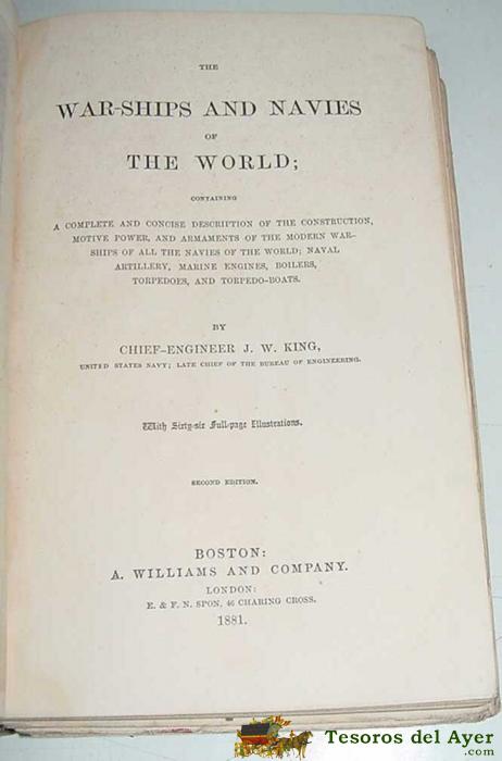 ANTIGUO LIBRO THE WAR-SHIPS AND NAVIES OF THE WORLD - POR J. W. KING - 1881. HISTORIA, DESCRIPCIóN Y PODER ARMAMENTíSTICO DE TODA CLASE DE EMBARCACIONES MILITARES, ILUSTRADO CON MUCHOS DIBUJOS A TODA PáGINA, CON SILUETAS DE BARCOS, SECCIONES, BATALLAS MARíTIMAS,TORPEDOS, ETC... - MIDE 24 X 16 CMS - FALTA PAGINAS DESDE LA 481 A LA 512 AMBAS INCLUIDAS, ALGUNA HOJA SUELTA.