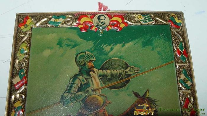 ANTIGUA CHAPA DE HOJALATA LITOGRAFIADA DEL QUIJOTE, CERVANTES, CRISTOBAL COLON - REVERSO CON PUBLICIDAD DE PRODUCTOS SERVUS, KAOL - BADALONA - RECUERDO DE LA EXPOSICION INTERNACIONAL DE BARCELONA - AÑO 1929 - MIDE 16 X 12 CMS - EXCELENTE ESTADO DE CONSERVACION.
