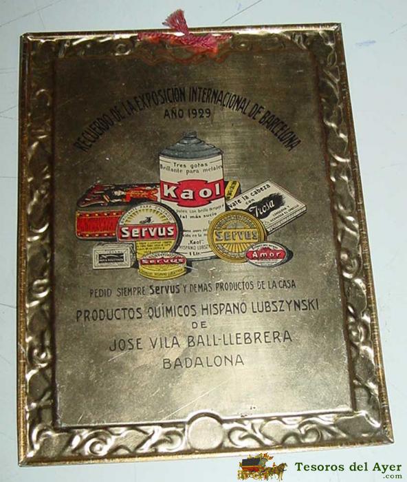 ANTIGUA CHAPA DE HOJALATA LITOGRAFIADA DEL QUIJOTE, CERVANTES, CRISTOBAL COLON - REVERSO CON PUBLICIDAD DE PRODUCTOS SERVUS, KAOL - BADALONA - RECUERDO DE LA EXPOSICION INTERNACIONAL DE BARCELONA - AÑO 1929 - MIDE 16 X 12 CMS - EXCELENTE ESTADO DE CONSERV