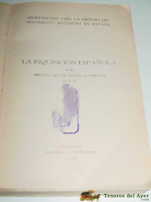 ANTIGUO LIBRO LA INQUISICION ESPAÑOLA - APORTACIONES PARA LA HISTORIA DEL SENTIMIENTO RELIGIOSO EN ESPAñA - POR PINTA LLORENTE, MIGUEL DE LA - ARCHIVO AGUSTINIANO 1948 - MIDE 14 X 21 CMS - 453 PAG - TIENE ILUSTRACIONES, SELLO DEL ANTRIOR PROPIETARIO.