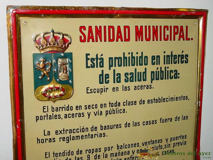 ANTIGUA CHAPA DE HOJALATA LITOGRAFIADA AÑOS 20 APRX. - SANIDAD MUNICIPAL DEL AYUNTAMIENTO DE MADRID - CON PROHIBICIONES Y OBLIGACIONES DE INTERES PARA LA SALUD PUBLICA - FABRICANTE EMILIO ZURITA DE MADRID - MIDE 51 X 35,5 CM APROX. - EXCELENTE ESTADO DE CONSERVACION, PIEZA DE MUSEO.