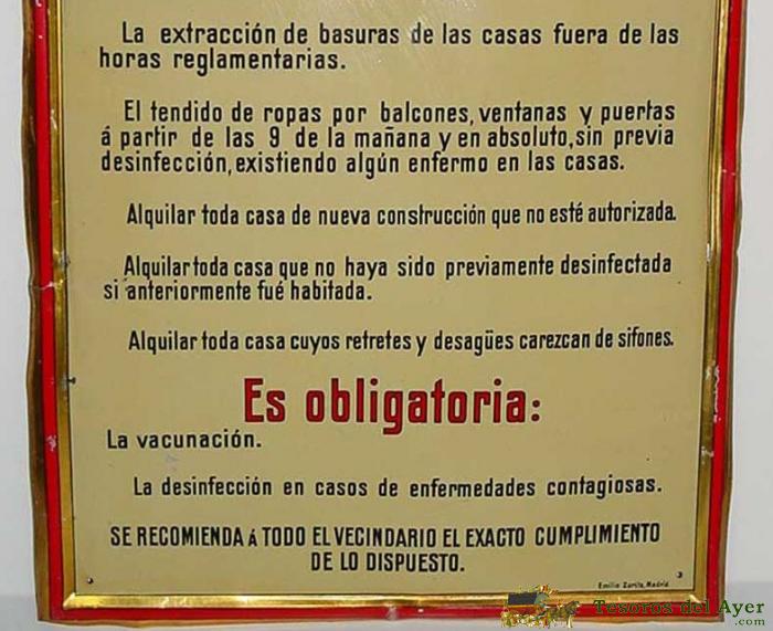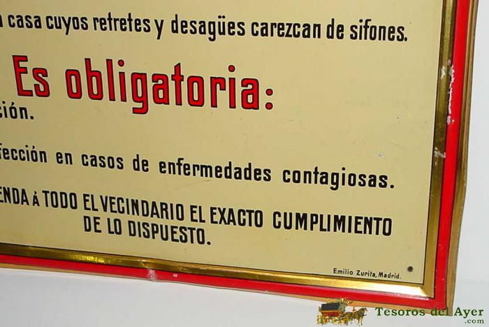 ANTIGUA CHAPA DE HOJALATA LITOGRAFIADA AÑOS 20 APRX. - SANIDAD MUNICIPAL DEL AYUNTAMIENTO DE MADRID - CON PROHIBICIONES Y OBLIGACIONES DE INTERES PARA LA SALUD PUBLICA - FABRICANTE EMILIO ZURITA DE MADRID - MIDE 51 X 35,5 CM APROX. - EXCELENTE ESTADO DE C