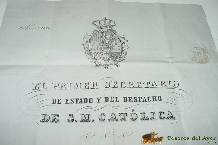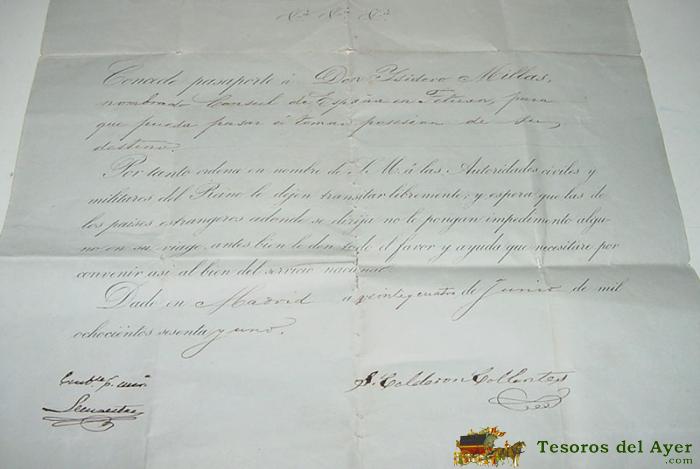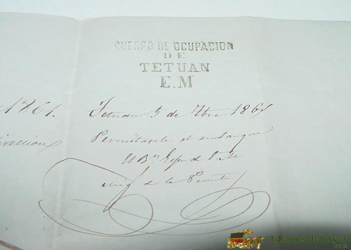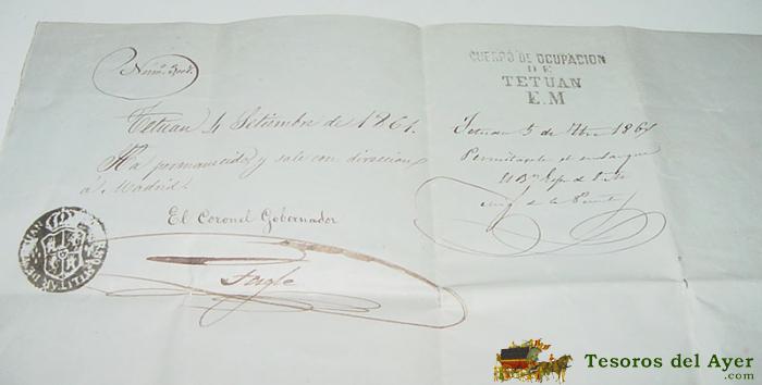 ANTIGUO PASAPORTE DE DE 1861, OTORGADO POR EL PRIMER SECRETYADO DE ESTADO Y DEL DESPACHO DE S.M CATOLICA A FAVOR DEL CONSUL DE ESPAÑA EN TETUAN PARA QUE PUEDA PASAR A TOMAR POSESION DE SU DESTINO. EN LA PARTE TRASERA LLEVA SELLO DEL CUERPO DE OCUPACION DE TETUAN E.M. - TODO TAL COMO SE PUEDE VER EN LAS FOTOGRAFIAS PUESTAS - MIDE 43 X 27,5 CMS.