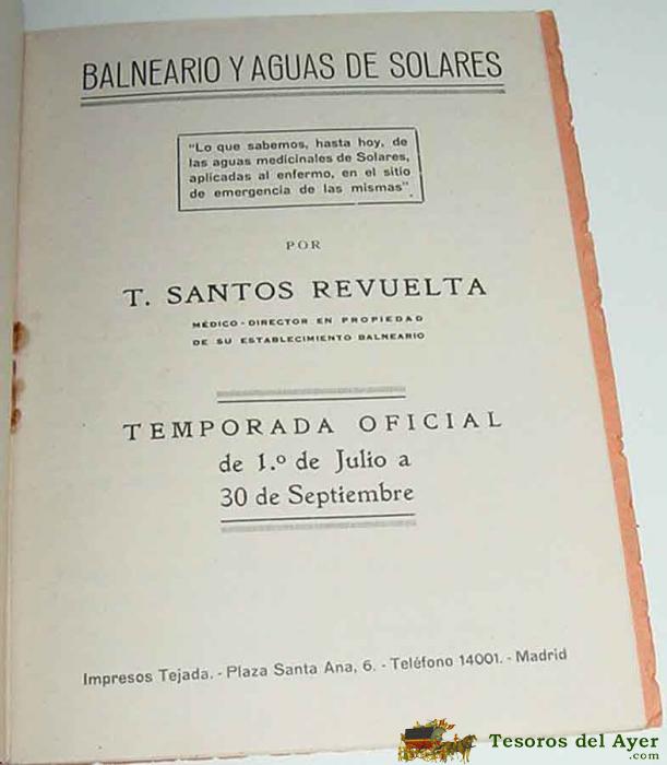 BALNEARIO Y AGUAS DE SOLARES (CANTABRIA). T. SANTOS REVUELTA - TEMPORADA OFICIAL DE 1 DE JULIO A 30 DE SEPTIEMBRE - TIENE 47 PAGINAS - MIDE 16 X 12 CMS. FOTOGRAFIAS, AÑOS 20 - 30