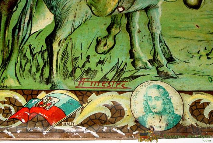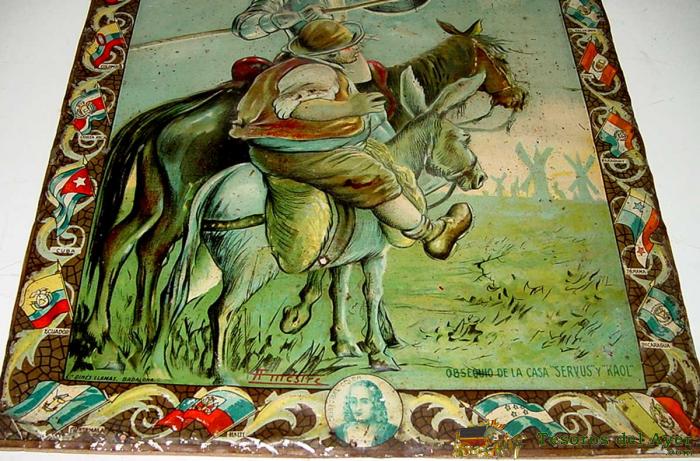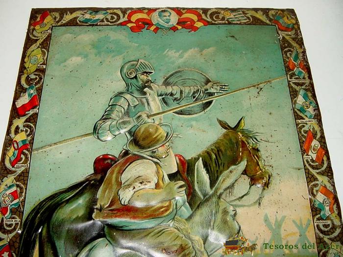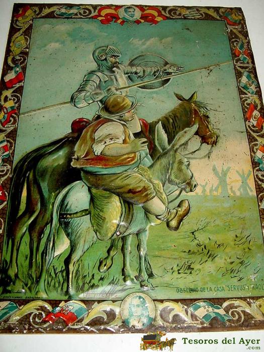 ANTIGUA CHAPA DE HOJALATA LITOGRAFIADA DEL QUIJOTE, CERVANTES, CRISTOBAL COLON - CON PUBLICIDAD DE PRODUCTOS SERVUS, KAOL - BADALONA - FIRMAD EN LA PARTE INFERIOR POR A. MESTRE - AÑO 1929 - GRAN TAMAÑO, MIDE 47,5 X 35 CMS - ESTA PEGADA SOBRE UNA MADERA DE 0,5 CMS DE GROSOR - RARA DE ENCONTRAR.