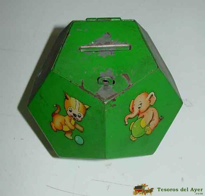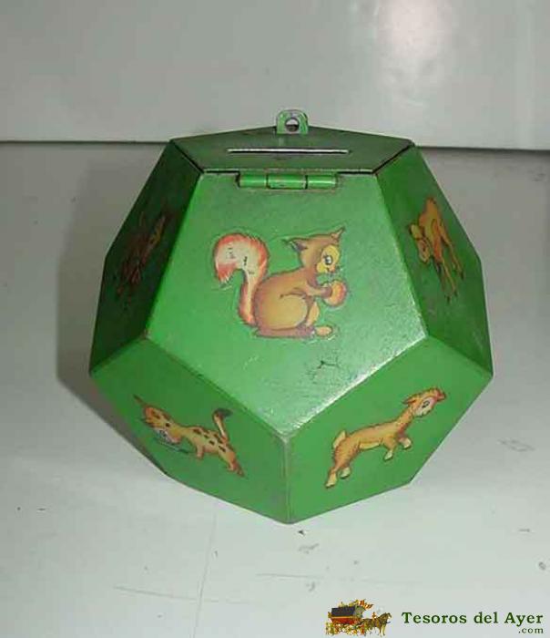 ANTIGUA HUCHA METALICA INFANTIL CON FORMA DE DODECAEDRO (DODECAEDRO ES UN POLIEDRO DE DOCE CARAS), ILUSTRACIONES CON ANIMALITOS - EXCELENTE ESTADO DE CONSERVACION, MIDE 10 CMS. DE ALTURA, TAL COMO SE VE EN LAS FOTOGRAFIAS