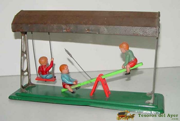 ANTIGUO COLUMPIO EN HOJALATA Y CELULOIDE ESPAñOL 28,5 X 16 CMS. - TAL COMO SE VE EN LAS FOTOGRAFIAS PUESTAS - FUNCIONA A CUERDA, PERO HAY QUE ARREGLARSELA.