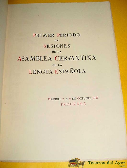 ASAMBLEA CERVANTINA DE LA LENGUA ESPAÑOLA - PROGRAMA DE 1947 - PRIMER PERÍODO DE SESIONES - DEL 2 AL 9 DE ABRIL DE 1947. IMPRESO EN HUECOGRABADO FOURNIER, VITORIA. MIDE 24,5 X 33 CM. 30 PÁGINAS CON FOTOGRAFÍAS Y GRABADOS