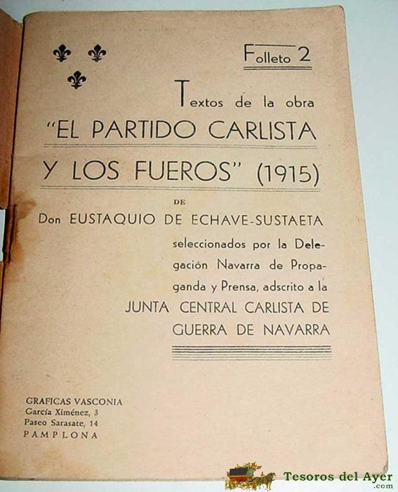 TEXTOS DE LA OBRA EL PARTIDO CARLISTA Y FUEROS - MARZO DE 1937, PLENA GUERRA CIVIL - - FOLLETO 2 - POR DON EUSTAQUI DE ECHAVE-SUSTAETA - ED. GRAFICAS VASCONIA, PAMPLONA - 55 PAG. - MIDE 15,5 X 11 CMS.