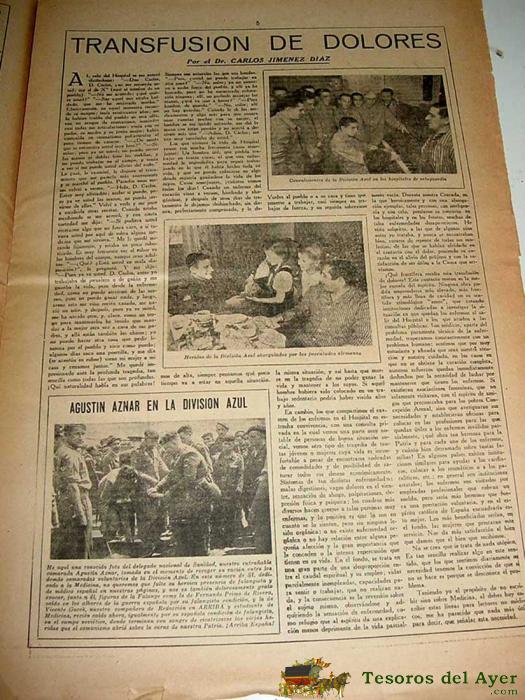 ANTIGUO PERIODICO SI, SUPLEMENTO SEMANAL DE ARRIBA - 1 DE FEBRERO DE 1942, NUM. 5 - DIVISION AZUL - ARTICULO CON FOTOGRAFIAS DE LA CONVALECIENCIAS DE LA DIVISION AZUL EN LOS HOSPITALES, HERIDOS, AGUSTIN AZNAR EN LA DIVISION AZUL, LA MEDICINA EN LA GUERRA