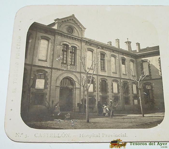 ANTIGUA FOTOGRAFIA ESTEREOSCOPICA DE CASTELLON . Nº 3 EL TURISMO PRACTICO . HOSPITAL PROVINCIAL - CARTAS COROGRAFICAS DE ESPAÑA . A MARTIN EDITOR - MIDE 17 X 8,2 CMS.