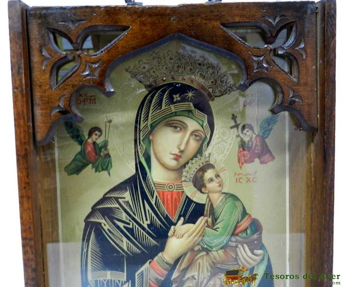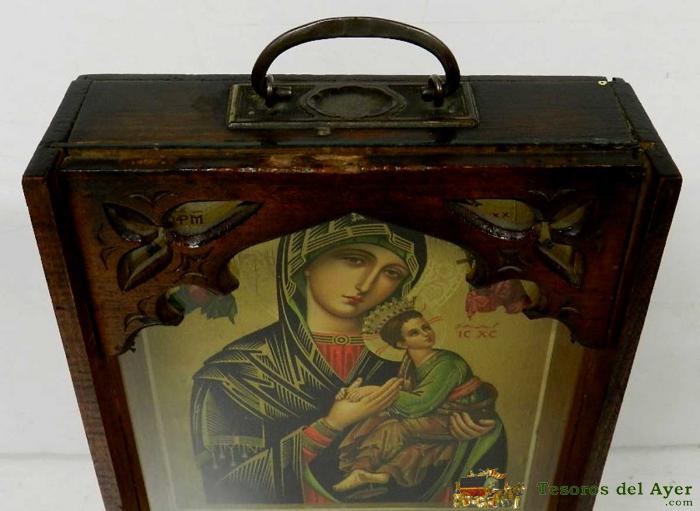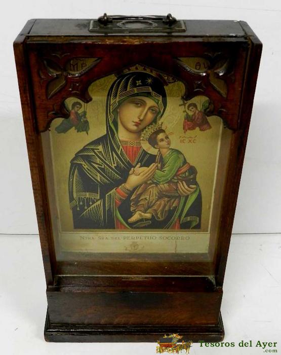 ANTIGUA CAPILLA PORTATIL TRADICIONAL DE MADERA DE NUESTRA SEÑORA DEL PERPETUO SOCORRO - MIDE 40,5 X 23 CMS - LE FALTA EL CAJON DE LA HUCHA - COSTUMBRE POPULAR RELIGIOSA DE LLEVARLA POR LAS CASAS PARA REZAR DURANTE UNOS DÍAS Y PASARLA A OTRO DOMICILIO PARA CONTINUAR ASÍ INDEFINIDAMENTE - MUY ANTIGUA Y EN MUY BUEN ESTADO DE CONSERVACION.