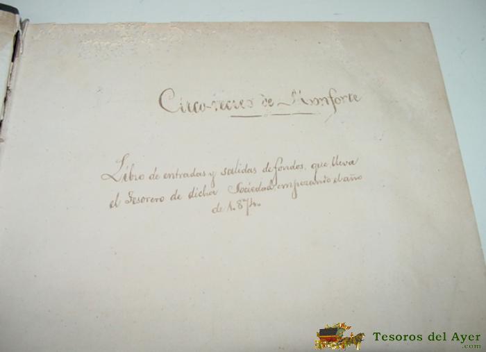 ANTIGUO LIBRO CIRCO RECREO DE MONFORTE - LIBRO DE ENTRADAS Y SALIDAS DE FONDOS QUE LLEVA EL TESORERO DE DICHA SOCIEDAD, COMIENZA EN EL AÑO DE 1874 HASTA MARZO DE 1875 - MANUSCRITO - MIDE 32 X 23 CMS.