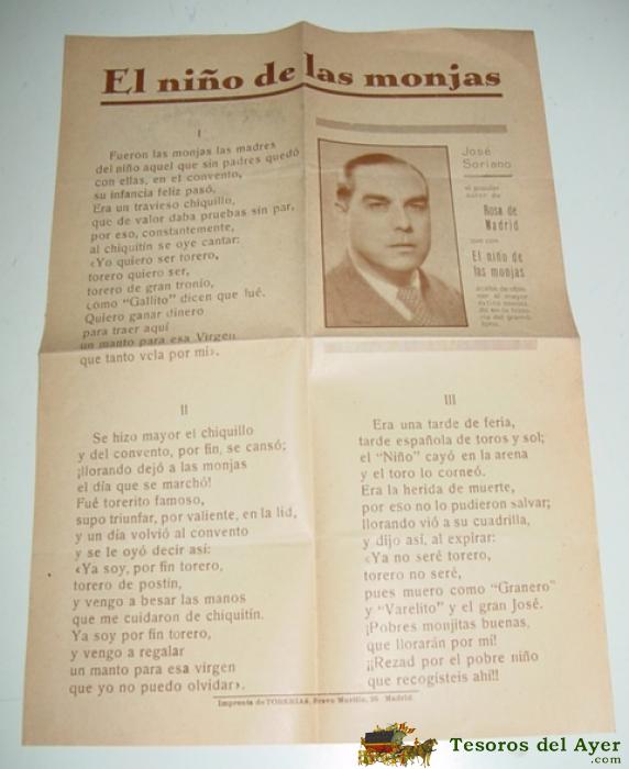 ANTIGUO CARTEL CANCIONERO DEL NIÑO DE LAS MONJAS - CON PUBLICIDAD DE REGAL - IMPRENTA DE TORERIAS, MADRID - MIDE 32 X 23 CMS.