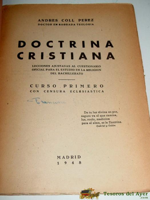 ANTIGUO LIBRO DOCTRINA CRISTIANA - POR ANDRES COLL PEREZ - DOCTOR EN SAGRADA TEOLOGIA - LECCIONES AJUSTADAS AL CUESTIONARIO OFICIAL PARA EL ESTUDIO DE LA RELIGION DEL BACHILLERATO - CURSO PRIMERO CON CENSURA ECLESIASTICA - MADRID 1948 - MIDE 22 X 16 CMS - 160 PAG.