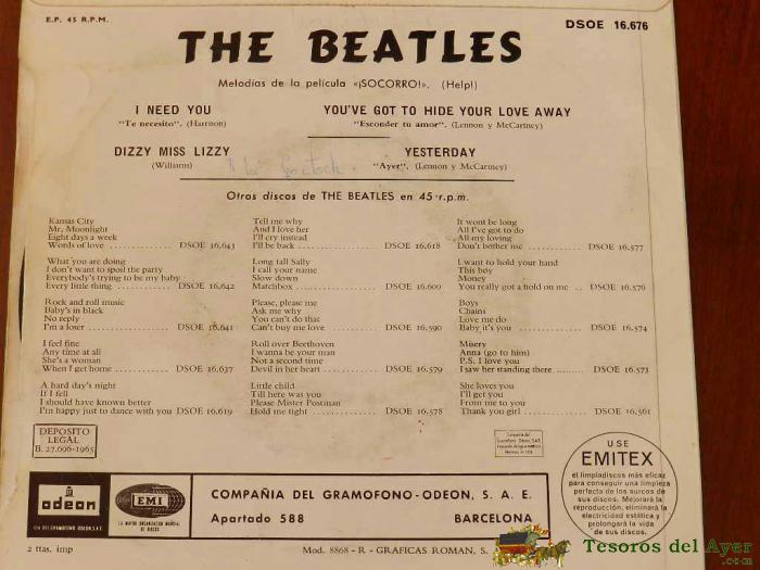 THE BEATLES HELP! - DISCO DE VINILO - I NEED YOU / DIZZY MISS LIZZY / YESTERDAY / YOU VE GOT TO HIDE YOUR - E.P. 45 R.P.M. - AÑO 1965 - ED. ODEON.