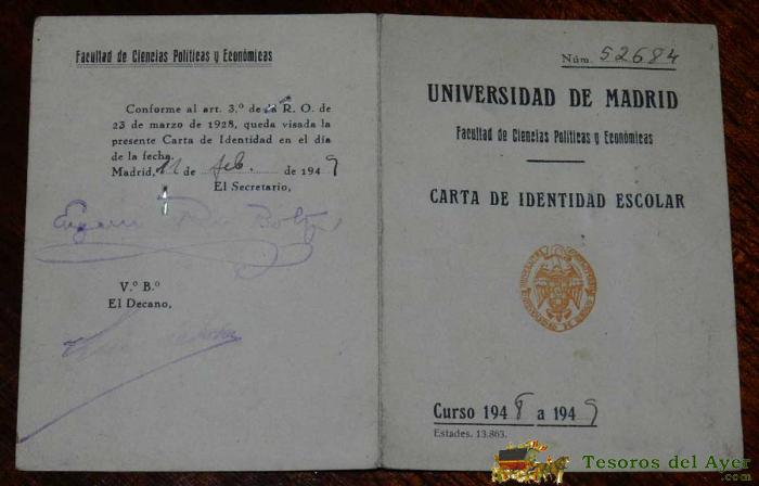 ANTIGUO CARNET O CARTA DE IDENTIDAD ESCOLAR DE LA UNIERSIDAD DE MADRID, FACULTAD DE CIENCIAS POLITICAS Y ECONOMICAS - CURSO 1948 A 1949 - MIDE DESPLEGADO 16 X 10,7 CMS.
