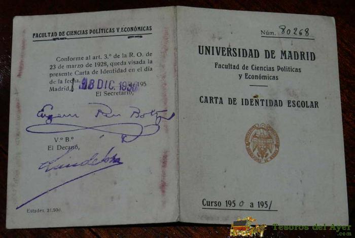 ANTIGUO CARNET O CARTA DE IDENTIDAD ESCOLAR DE LA UNIERSIDAD DE MADRID, FACULTAD DE CIENCIAS POLITICAS Y ECONOMICAS - CURSO 1950 A 1951 - MIDE DESPLEGADO 16 X 10,7 CMS.