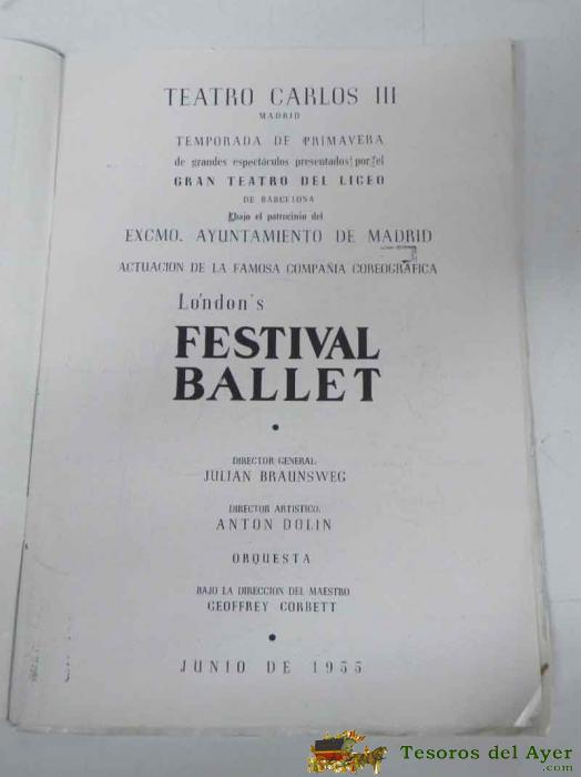 PROGRAMA FESTIVAL DE BALLET TEATRO CARLOS III MADRID JUNIO 1955 - OPRESENTADO POR EL GRAN TEATRO DEL LICEO DE BARCELONA - - LONDON FESTIVAL BALLET - PROGRAMA COMPLETO CON 20 HOJAS FOTOGRAFIAS, REPERTORIO ETC