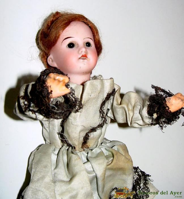 ANTIGUA MUÑECA ALEMANA DE 1900 PROCEDENTE DE AUTOMATA, CABEZA DE PORCELANA CON MARCA 11/0 PELO DE MOHAIR, OJO DE CRISTAL Y BOCA ABIERTA. CUERPO DE MADERA Y MUELLES PARA SU MOVIMIENTO, ROPA DE ORIGEN, MIDE 24 CMS.