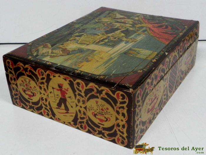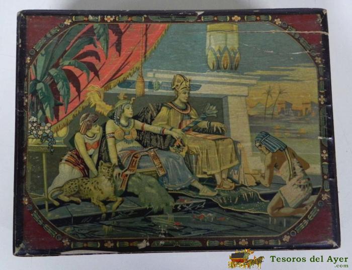 ANTIGUA CAJA DE MADERA PARA LAS LABORES DE LOS NIñOS, CON PRECIOSA ILUSTRACION DE MOTIVOS EGIPCIOS, TIENE UN ESPEJO EN LA CONTRA-TAPA, MIDE 29 X 22,5 CMS.
