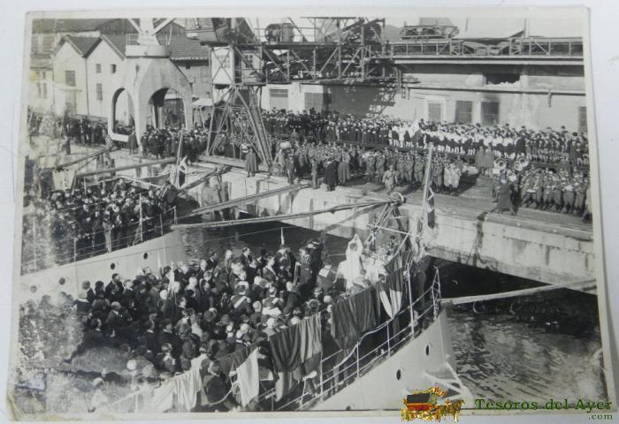ANTIGUA FOTOGRAFIA DE LA BANDA DE MUSICA DE LA LEGION PORTUARIA DE GENOVA, ITALIA, DURANTE LA CELEBRACION DE UNA MISA A BORDO DE UN BUQUE DE GUERRA, AñOS 1930, MIDE 17,5 X 12,5 CMS. FOTO CAV. A. CALOSSO