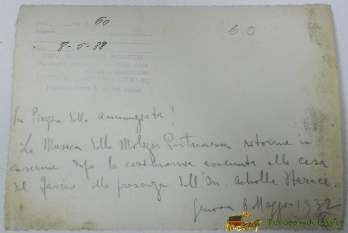 ANTIGUA FOTOGRAFIA DE LA BANDA DE MUSICA DE LA LEGION PORTUARIA DE GENOVA, ITALIA, EN UN DESFILE, 8 DE MAYO DE 1932, MIDE 17,6 X 12,5 CMS. FOTO CAV. GIOVANNI AGOSTO