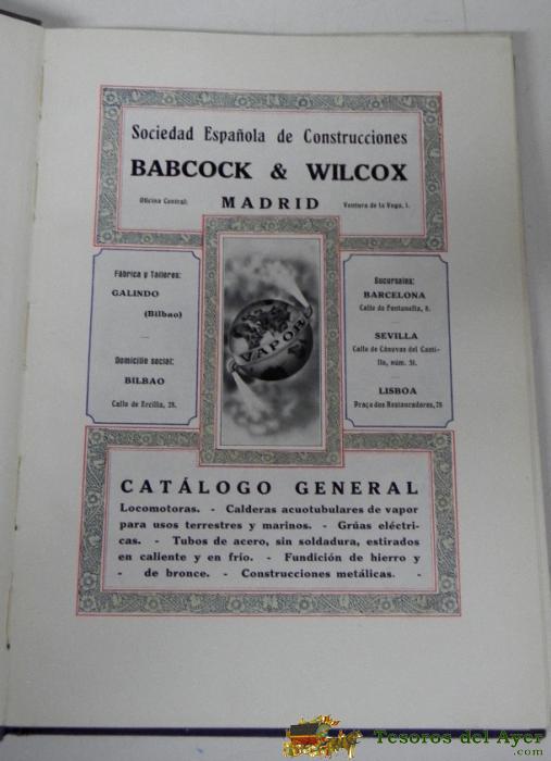 ANTIGUO CATALOGO GENERAL DE LA SOCIEDAD ESPAÑOLA DE CONSTRUCCIONES BABCOCK & WILCOX, CATALOGO GENERAL, GALINDO, BILBAO, MADRID, AÑOS 20, ED. ARTES GRáFICA SUCESORES DE RIVADENEYRA, MADRID. PRIMERO NOS MUESTRA LA FáBRICA Y LAS DISTINTAS DEPENDENCIAS Y LO QUE EN ELLAS SE HACE; LA FUNDICIóN DE HIERRO, DE BRONCE, LA CONSTRUCCIóN DE GRUAS, LOCOMOTORAS, APARATOS PARA DESCARGAR VAGONES, TUBOS, CALDERAS DOMéSTICAS, PARA BARCOS, NOS HABLA DEL LABORATORIO, LAS OFICINAS, EL BOTIQUíN... TELA CON DORADOS EN CUBIERTA. MIDE 26 X 19 CMS. 214 PAGINAS EN PAPEL COUCHE. CON ILUSTRACIONES DE DIVERSA TECNICA, ALGUNA A COLOR.
