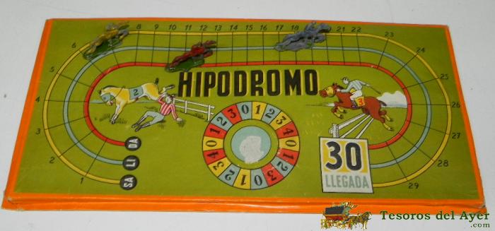 ANTIGUO JUEGO DE MESA HIPODROMO, TAL COMO SE VE EN LAS FOTOGRAFIAS, COMPLETO CON INSTRUCCIONES Y LOS CABALLOS DE PLOMO, SOLAMENTE LE FALTA LA FLECHA DEL CENTRO DEL JUEGO, TODO ANTIGUO, LA CAJA MIDE 35 X 16,5 X 2,5 CMS. AÑOS 30
