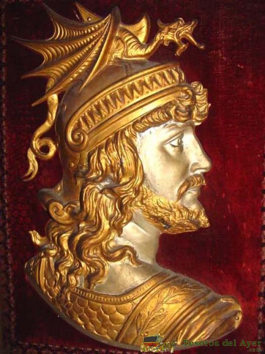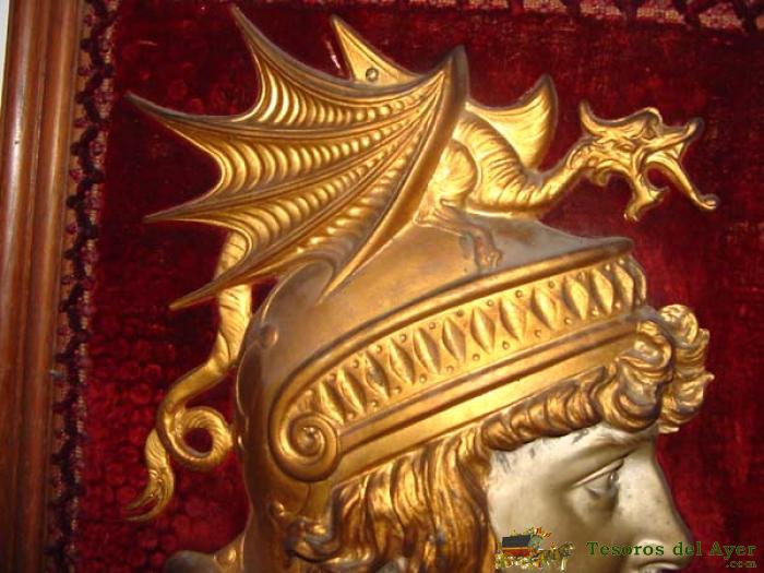 ANTIGUO CUADRO CON LA CABEZA DE EL PERSONAJE MITOLOGICO ALEMAN - SIGFRIDO - R. WAGNER - EN RELIEVE REALIZADA EN HIERRO Y ATORNILLADA AL CUADRO DE MADERA QUE MIDE 58 X 45,5 CMS - ESTE PERSONA NACE DE LA OPERA - EL OCASO DE LOS DIOSES - R. WAGNER (1813 - 1883) - ESTRENADA EN BAYREUTH EL 17 DE AGOSTO DE 1876. LUGAR DE LA ACCIóN: EN LA ROCA DE LAS WALKYRIAS Y A LAS ORILLAS DEL RHIN. SIGFRIDO, EN EL CABALLO DE BRUNHILDA, VUELVE A SUS AVENTURAS, DEJANDO EN PODER DE AQUéLLA EN ANILLO MALDITO; PERO LLEVANDO SOBRE Sí LA MALDICIóN. HAGEN DA A SIGFRIDO OTRA BEBIDA QUE LE HACE RECOBRAR LA MEMORIA, Y CUANDO RELATA SUS HAZAñAS Y SUS AMORES CON BRUNHILDA, HAGEN, POR LA ESPALDA, LE ATRAVIESA CON UNA LANZA - DEBE PESAR CERCA DE 7 KILOGRAMOS