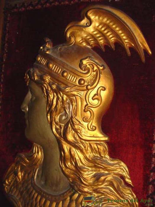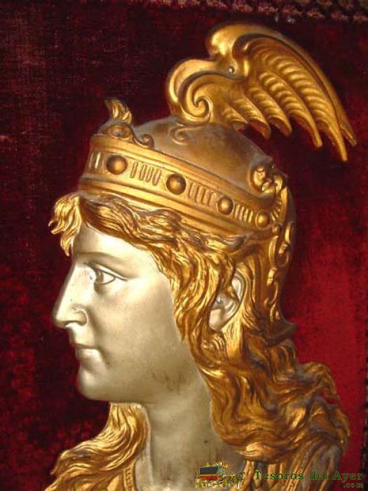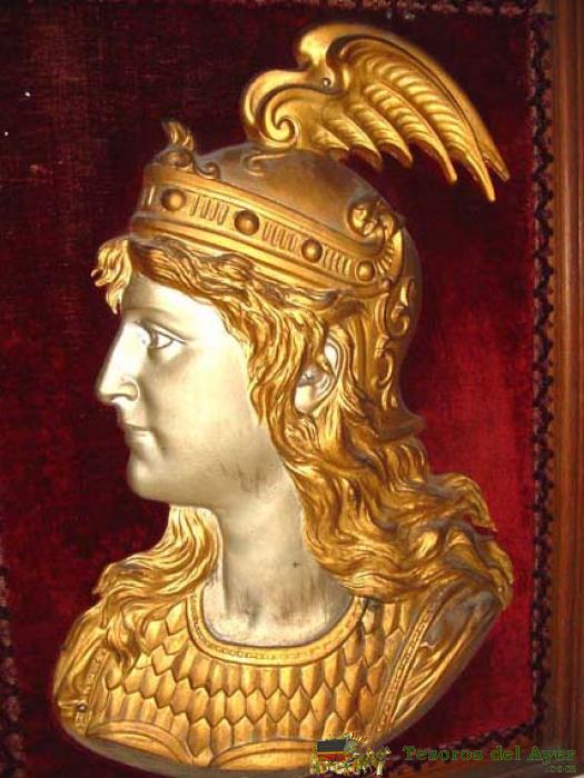 ANTIGUO CUADRO CON LA CABEZA DE EL PERSONAJE MITOLOGICO ALEMAN - BRUNHILDA - R. WAGNER - EN RELIEVE REALIZADA EN HIERRO Y ATORNILLADA AL CUADRO DE MADERA QUE MIDE 58 X 45,5 CMS - ESTE PERSONA NACE DE LA OPERA - EL OCASO DE LOS DIOSES - R. WAGNER (1813 - 1883) - ESTRENADA EN BAYREUTH EL 17 DE AGOSTO DE 1876. LUGAR DE LA ACCIóN: EN LA ROCA DE LAS WALKYRIAS Y A LAS ORILLAS DEL RHIN. SIGFRIDO, EN EL CABALLO DE BRUNHILDA, VUELVE A SUS AVENTURAS, DEJANDO EN PODER DE AQUéLLA EN ANILLO MALDITO; PERO LLEVANDO SOBRE Sí LA MALDICIóN. HAGEN DA A SIGFRIDO OTRA BEBIDA QUE LE HACE RECOBRAR LA MEMORIA, Y CUANDO RELATA SUS HAZAñAS Y SUS AMORES CON BRUNHILDA, HAGEN, POR LA ESPALDA, LE ATRAVIESA CON UNA LANZA - DEBE PESAR CERCA DE 7 KILOGRAMOS