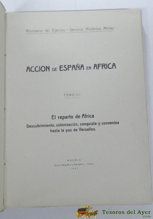 ACCION DE ESPAÑA EN AFRICA. TOMO III: EL REPARTO DE AFRICA. DESCUBRIMIENTO, COLONIZACIóN, CONQUISTA Y CONVENIOS HASTA LA PAZ DE VERSALLES. SERVICIO GEOGRáFICO Y CARTOGRáFICO, 1941, 20X28, 162 PáGS. 3 MAPAS PLEGADOS Y NUMEROSAS LáMINAS CON FOTOGRAFíAS EN S
