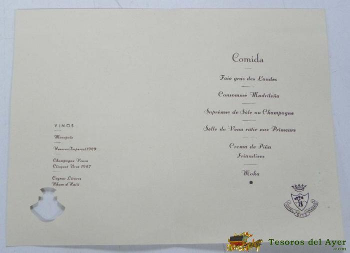 ANTIGUA MINUTA DEL HOTEL RITZ, MADRID, MENU DE LA CENA DE GALA OFRECIDA POR LA EMBAJADA DE HAITI, EL 16 DE DICIEMBRE DE 1953 EN HONOR AL MINISTRO DE ASUNTOS EXTERIORES MARTIN ARTAJO Y MUJER, MIDE 15,5 X 10,5 CMS.