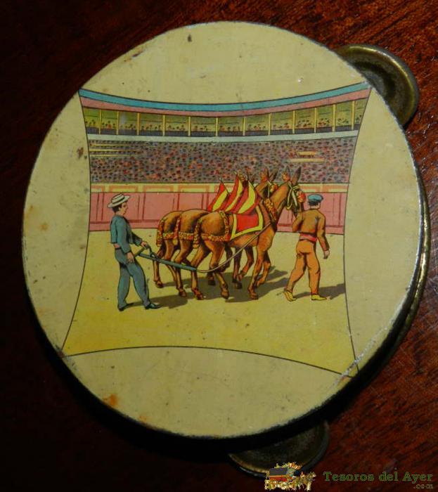 ANTIGUA PANDERETA DE HOJALATA LITOGRAFIADA CON MOTIVOS TAURINOS, MIDE 13,5 CMS. DE DIAMETRO, BUEN ESTADO DE CONSERVACION.
